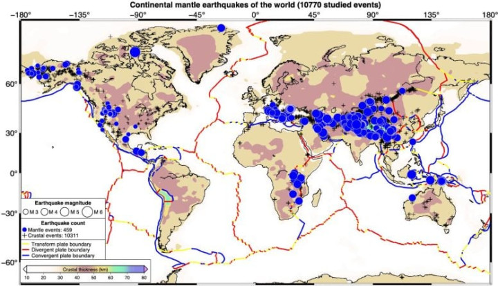 这份舆图包含了从一九九零年以来发现的四百五十九次地幔地震,它们散布在人人各地,从喜马拉雅山脉下方到白令海峡隔邻,从意大利到青藏高原。