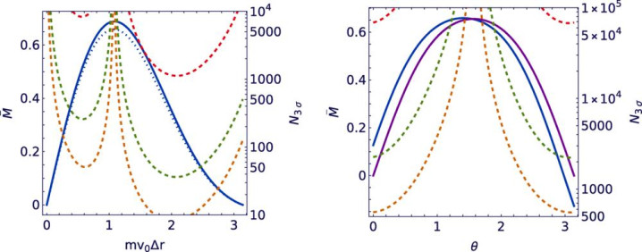 左图:平均信号与所示参数的相关;虚线表示在不同噪声水平下达到 3σ 检测所需的测量次数。右图:兼并物理量与星河系中心角度的相关,区分沟通和不沟通年度调制;虚线相似表示所需的测量次数,表情表示噪声强度。图片开始:《物理驳倒快报》